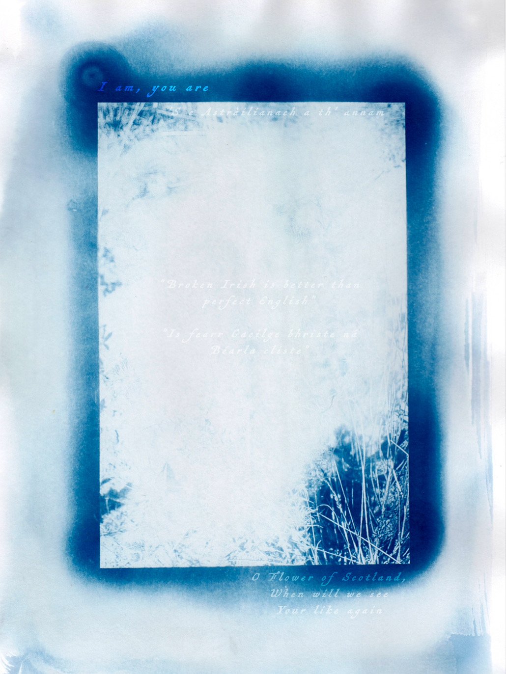 Artist Statement: At the core of my practice lies a reckoning with cultural heritage, a dialogue between the land I live upon and the lineage I carry. My Celtic cultural heritage is not a measurement but a beckoning from the past, a call to listen for what remains beneath the surface. I often dwell in the space of two worlds, the rhythms of Celtic traditions and cultural connection and the rare, elemental beauty of the Australian landscape that shaped me. This in-between is occupied with absences. The loss of a language and story is felt not only as a sadness, a recognition of cultural destruction, but as a yearning, a visceral desire to reconnect, to reimagine my belonging. My work becomes a symbolic vessel for this longing, a way to trace the silhouettes of identity through materials.I anchor this exploration in two mediums: cyanotypes and glass. Cyanotypes deep indigo blues stain a memory, its chemical imprints the act of preservation. Glass, delicate yet enduring, becomes a metaphor for cultural transmission: what persists, what ruptures, what alters. In both, there is a tension between permeance and vulnerability, between what is held on and what slips away through the generations. The triptych form, drawn from Celtic religious architecture, offers a structure for continuity of past, present, future as a time of healing each stage. Through these forms, I engage with broader questions of identity and belonging: How do we inherit culture when its language is lost? How does place shape our understanding of self? And how can making become a form of reconnection?